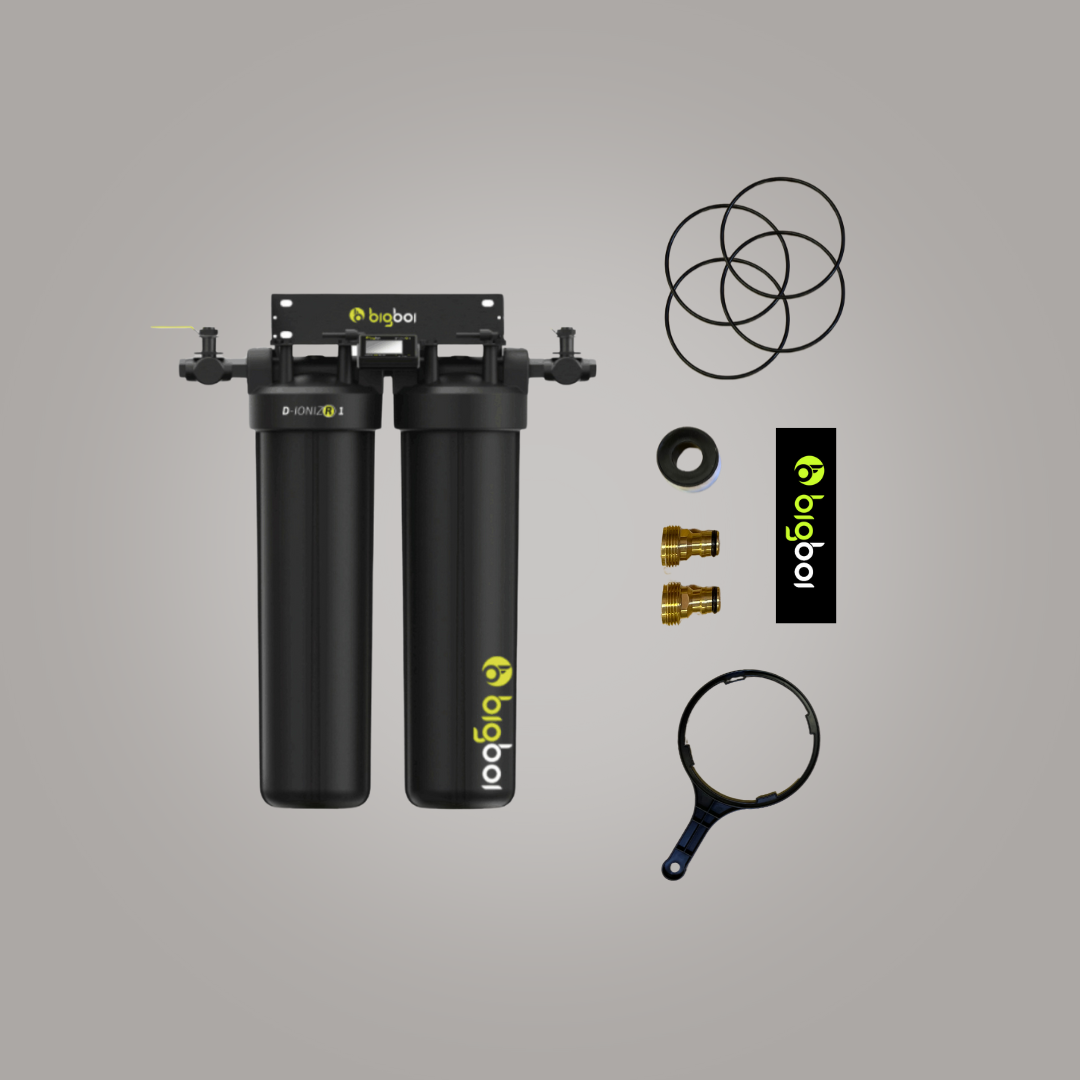 The D-IONIZR system includes all parts needed for setup. Simply hand tighten the tanks to install, apply thread tape to connections, and follow the included instructions.