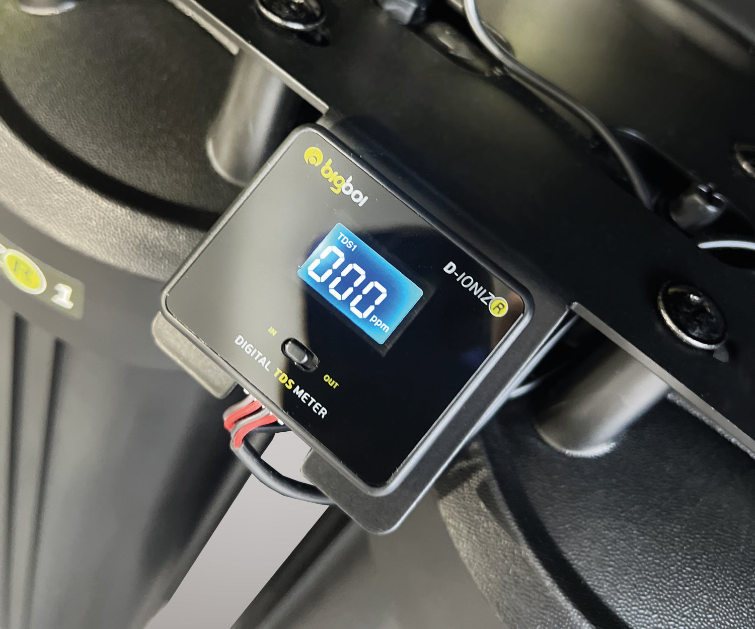 The D-IONIZR features a dual-stage filtration system. The first stage is a composite carbon filter that reduces water hardness and removes impurities, extending the life of the second-stage deionized resin filter. This resin filter reduces water to 0PPM (parts per million), giving you pure water for a spotless finish. Equipped with a built-in digital TDS meter, you can monitor water purity at a glance, while the innovative bypass valve allows you to preserve filter life by using the system only when needed.