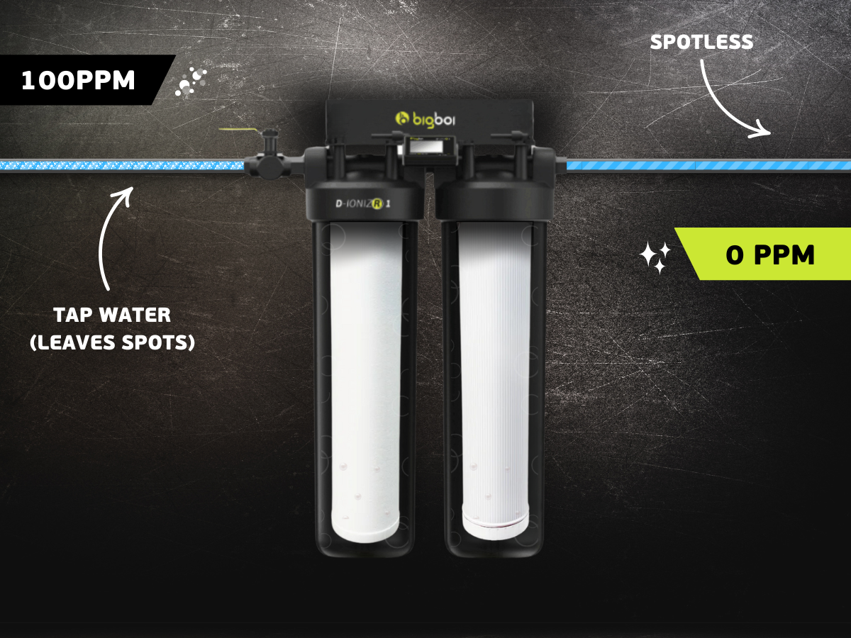 Goodbye Water Spots! The D-IONIZR water filtration system has been designed to make washing simple. The bigboi D-IONIZR system allows you to wash your car without the inconvenience of water spotting during the washing / drying process. Let's breakdown how the unit works.